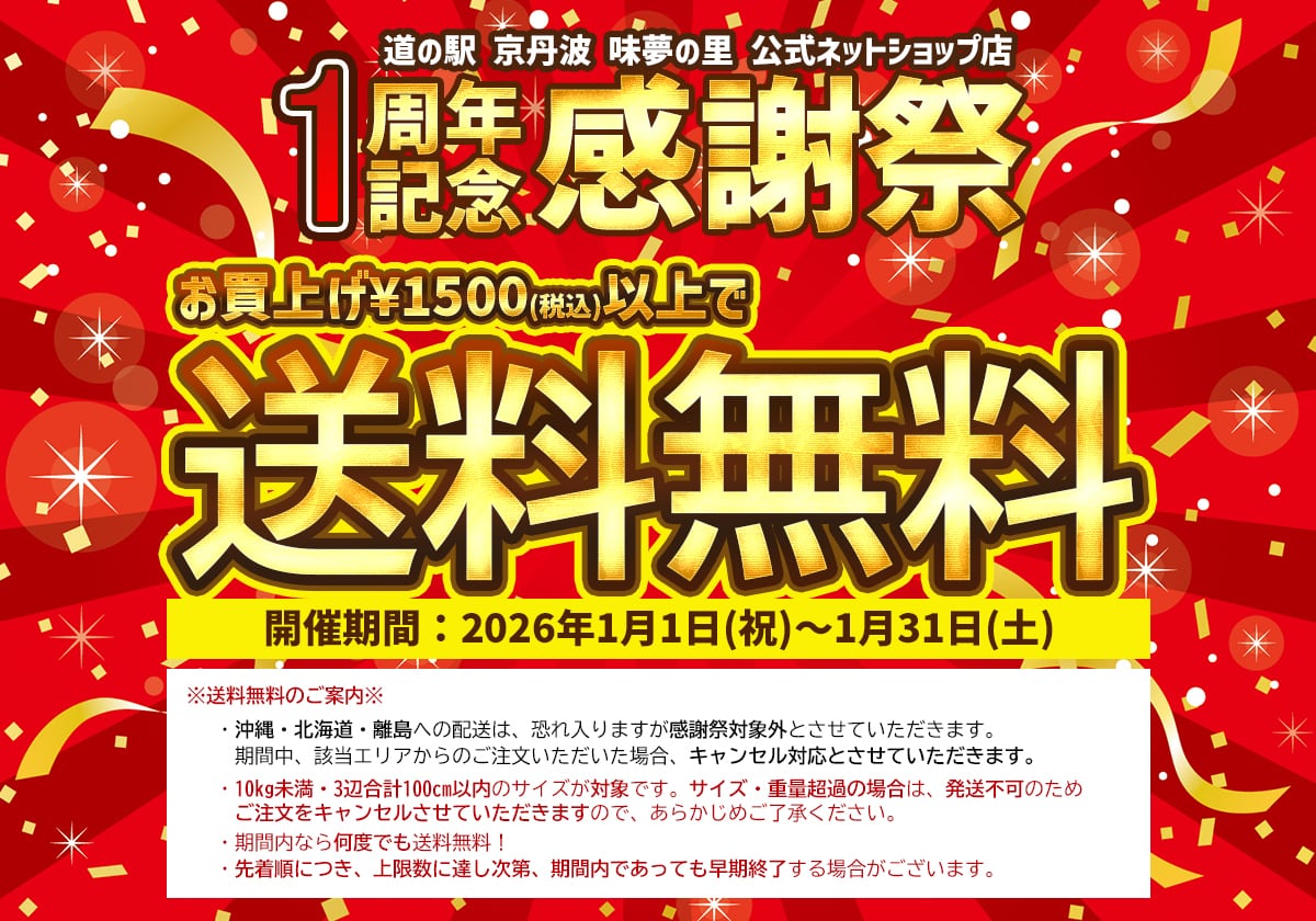 2026年1月 新年あけましておめでとうございます。本年も宜しくお願い致します。公式ネットショップ開設1周年を迎えることができました。《送料無料》の感謝祭のこの機会にお買い物をお楽しみくださいませ。2025年7月 実店舗との在庫連動のため、リアル在庫に変動がございます。ご注文の際、在庫不足ございましたら、お手数ですがお問い合わせくださいませ。2024年10月 道の駅 京丹波 味夢の里 公式オンラインショップOPENしました。