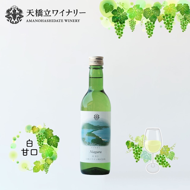 -     ナイヤガラ(白・甘口)360ml【天橋立ワイン】 ¥891 名称:白ワイン アルコール度数:10% 内容量:360ml 品種:ナイヤガラ タイプ・味わい:白・甘口 生産年:NV 製造元:天橋立ワイン株式会社 〒629-2234 京都府宮津市国分123 マスカットのようなフルーティーな香りと爽やかな甘さが大人気の甘口白ワインです。 食前酒やデザートなどに。