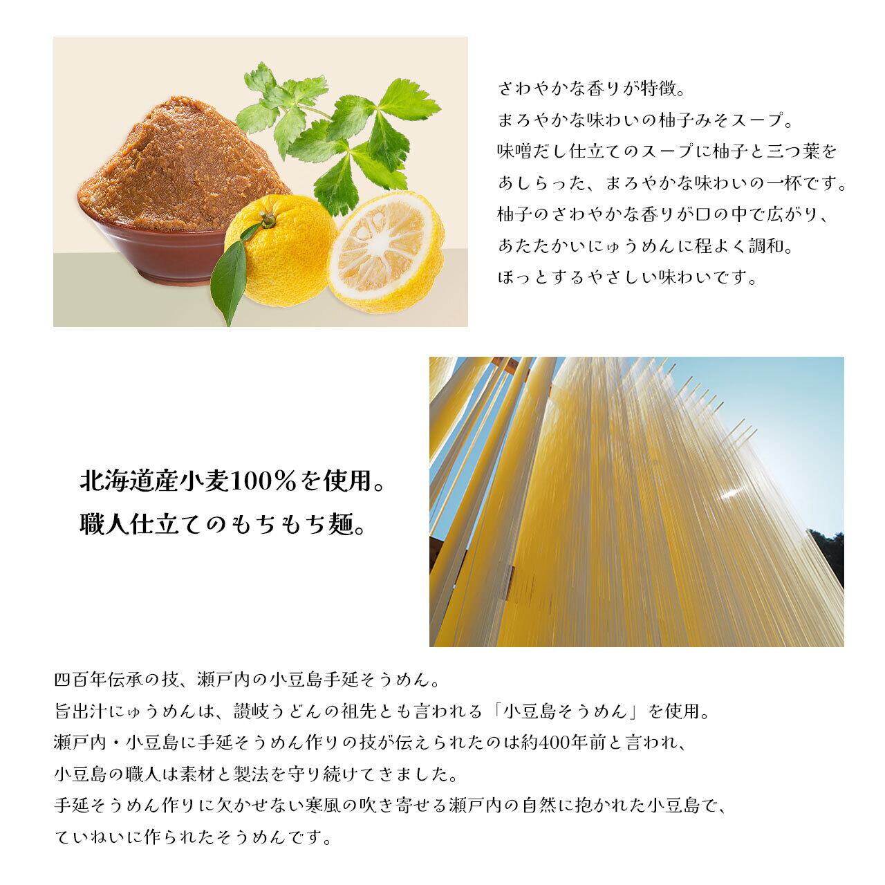 お湯を注ぐだけで出来上がる、ほっとするやさしい味わいのにゅうめんです。北海道産小麦100%のそうめんを特殊製法で乾燥。ノンフライの即席麺でありながら、つるっとした本格的な手延べの喉越しに仕上げました。柚子と三つ葉がアクセントのまろやか味噌だし仕立てのスープの味わいをお楽しみください。