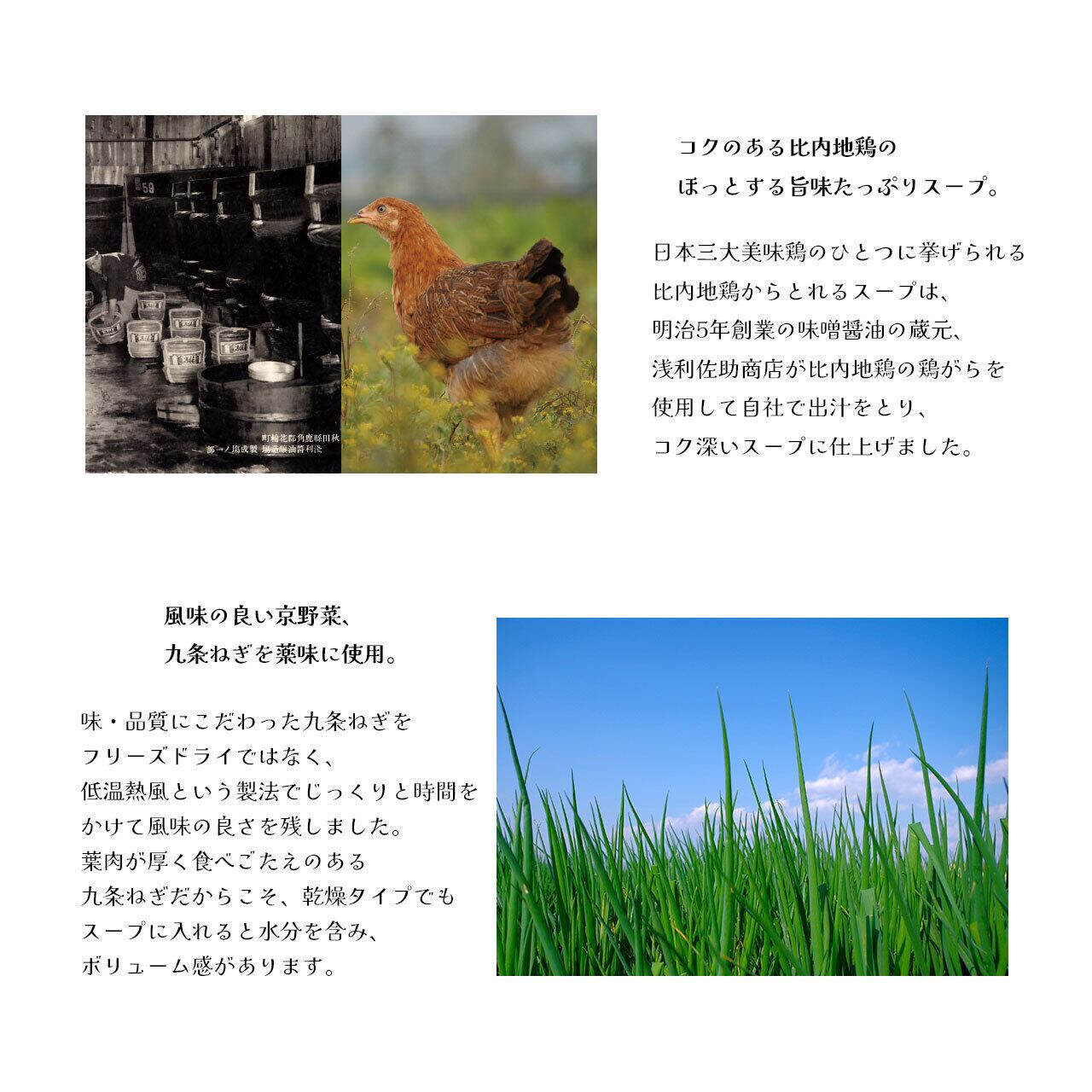 お湯を注ぐだけで出来上がる、ほっとするやさしい味わいのにゅうめんです。北海道産小麦100%のそうめんを特殊製法で乾燥。ノンフライの即席麺でありながら、つるっとした本格的な手延べの喉越しに仕上げました。日本三大美味鶏のひとつにあげられる比内地鶏のスープと食べごたえのある九条ねぎの味わいをお楽しみください。