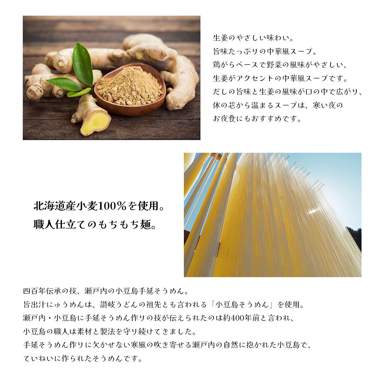 お湯を注ぐだけで出来上がる、ほっとするやさしい味わいのにゅうめんです。北海道産小麦100%のそうめんを特殊製法で乾燥。ノンフライの即席麺でありながら、つるっとした本格的な手延べの喉越しに仕上げました。鶏がらベースで、生姜がアクセントの中華風スープの味わいをお楽しみください。