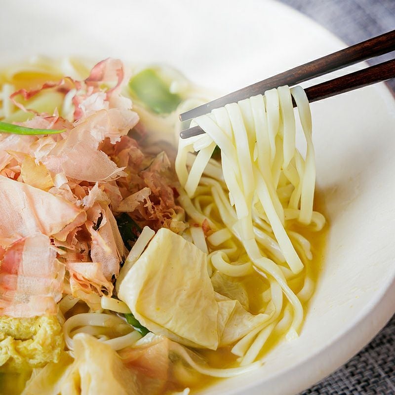 お湯を注ぐだけで出来上がる、やさしい味わいのカレーうどんです。北海道産小麦100%のうどんを特殊製法で乾燥。ノンフライの即席麺でありながら、食べ応えのあるコシに仕上げました。