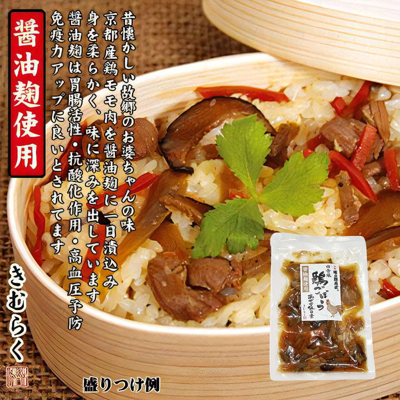 原材料:鶏もも肉(京都府産)、しょうゆ(本醸造)(小麦・大豆を含む)、塩蔵人参、ごぼう、乾しいたけ、こんにゃく、砂糖、本みりん、清酒、魚介調味エキス、生しょうゆ麹、たん白加水分解物(豚肉を含む)