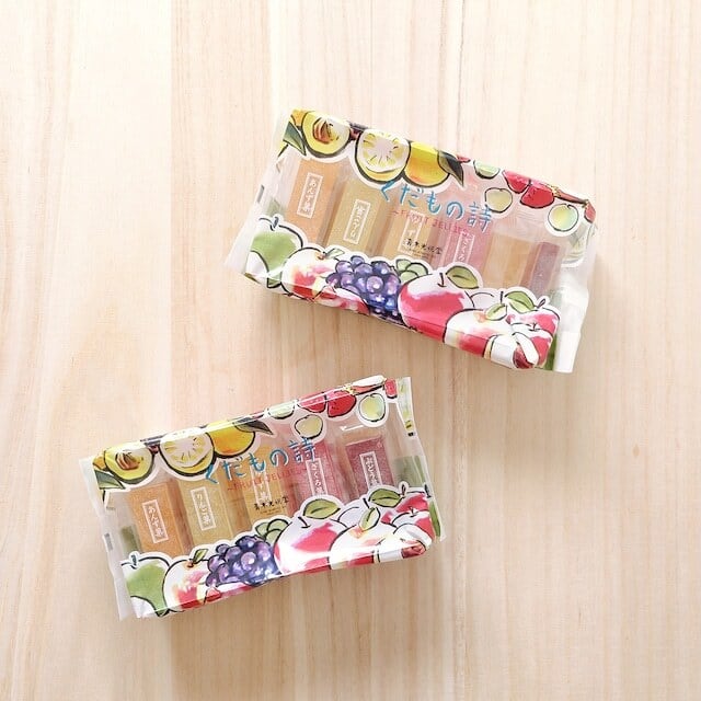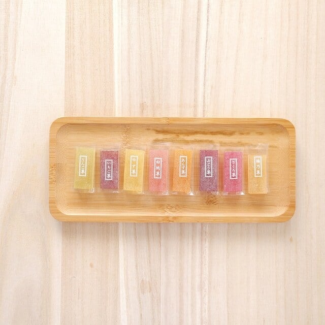 原材料:水飴(国内製造)、砂糖、果汁(りんご、ぶどう、いちご、もも、うめ、ざくろ、あんず、ゆず)、粉末オブラート(でん粉)/ゲル化剤(ペクチン)、酸味料、香料、着色料(アカキャベツ、紅花黄、紅麹、くちなし)、レシチン(大豆由来) ※本製品は小麦・乳・卵を含む製品と共通の設備で製造しております。