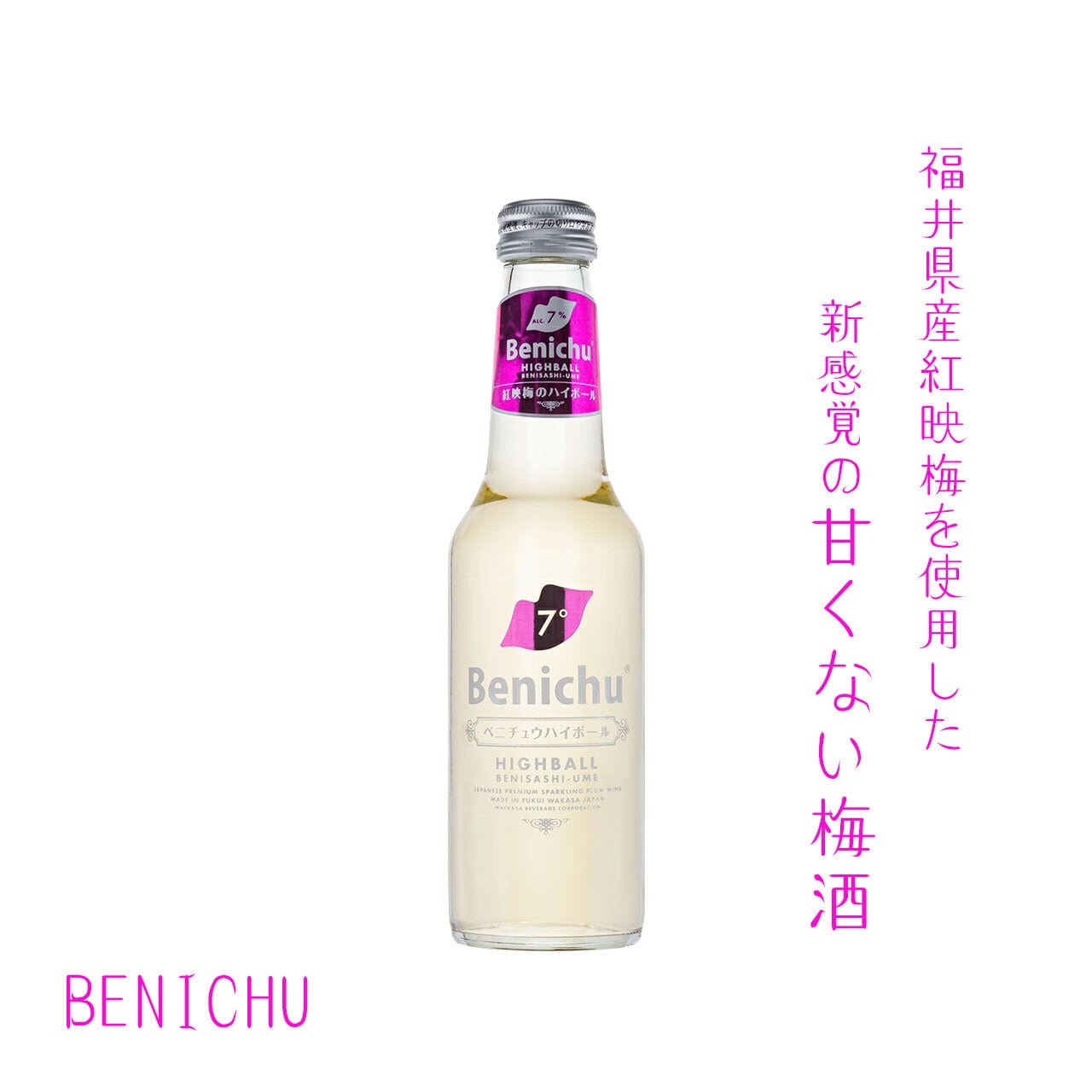 福井県産紅映梅を使用した新感覚の甘くない梅酒「BENICHU(ベニチュウ)」をベースに、爽快なキレ味で食事と相性の良いハイボールに仕上げました。