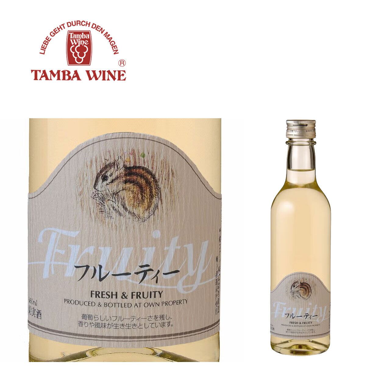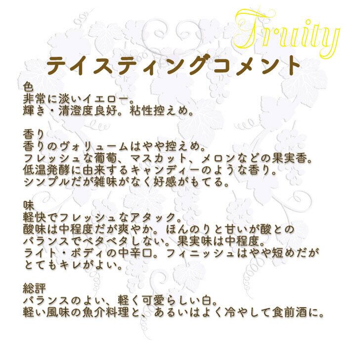 葡萄の新鮮なフルーティーさを十分に残し、気軽に楽しめる白ワインです。低温発酵させることにより、フレッシュな香りが特徴です。表ラベルのリスのイラストは、京都在住の日本画家、竹内浩一氏によるものです。